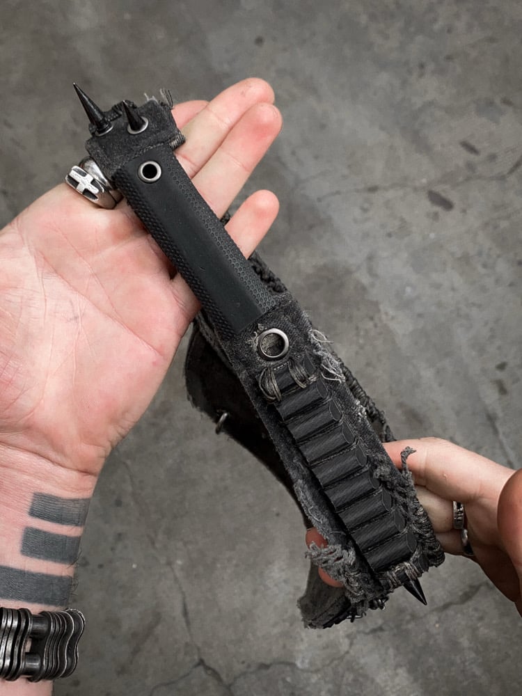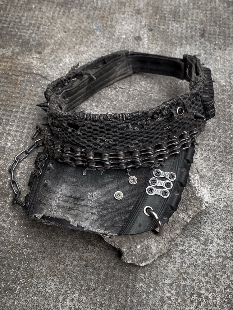 Constructed from distressed, layered materials, it features reinforced stitching, industrial metal hardware, and reclaimed elements that evoke a sense of battle-scarred endurance. The textured surfaces, worn edges, and integrated chain detailing create a visceral, aggressive silhouette that feels both tactical and rebellious.