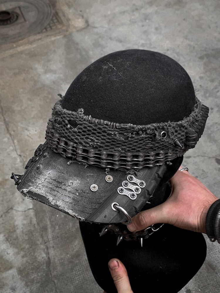 Built for ravers, punks, goths, and those navigating the edge of modern underground culture, it merges post-apocalyptic fashion with industrial attitude. The adjustable velcro strap ensures a secure fit, accommodating head sizes approximately 52–58 cm.